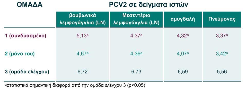 Μέσος όρος φορτίου PCV2 σε δείγματα ιστών (μέσος όρος log10 αντίτυπα/µl εξαγόμενου DNA)